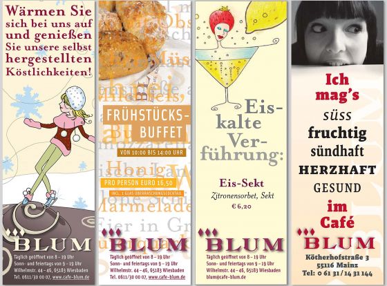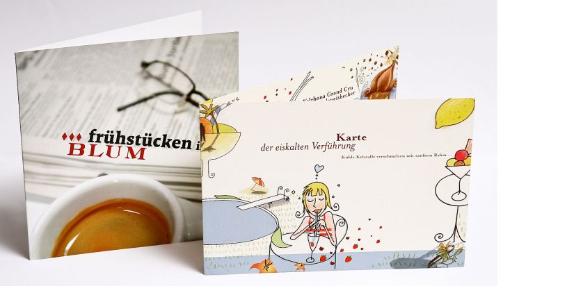 Zum einen gab es immer wieder Speisekarten zu gestalten, aber auch Schachteln für hausgemachte Kuchen, Tüten für Brot und Tragetaschen sollten das besondere des Café Blum unterstreichen. Der Humor kam nicht immer auf Anhieb gut an – aber auf Dauer bekam das Blum ein moderneres, frecheres Image, ohne die Stammkundschaft zu verprellen.
