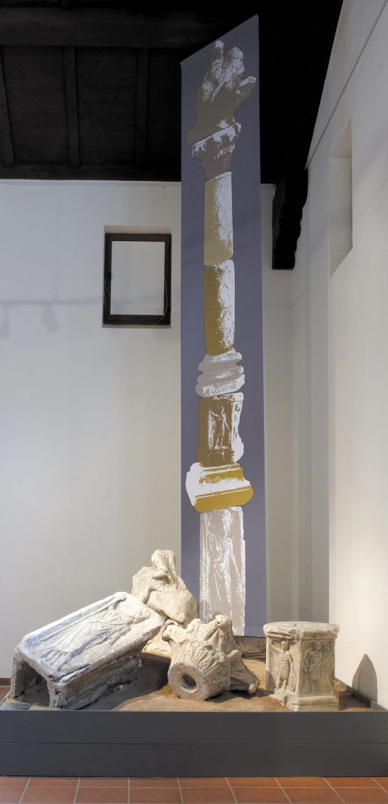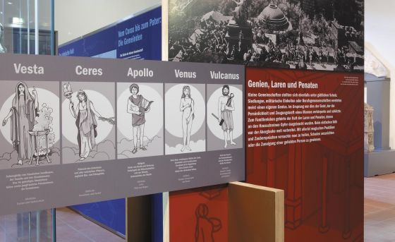 Die große Halle der fabrica im rekonstruierten Römerkastell Saalburg, ist ein höchst ungeeigneter Raum für die Inszenierung einer Ausstellung zu einem Kult, der in kleinen höhlenartigen Heiligtümern zelebriert wurde. Um dem Besucher dennoch einen realistischen Eindruck der tatsächlichen Größe eines Mithräums zu geben, ließ ich den Grundriss eines gut dokumentierten Mithräums in Holz nachbauen und die Funden in diesen integrieren.