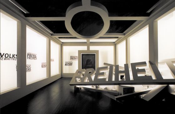 Dabei eröffnete sich mir eine völlig neue Gestaltungswelt – riesige Schriften wie Skulpturen, verzerrte Schlagwörter an der Wand, die Grundrechte als gläsernes Mobile, Wandbilder mit Rasterpunkten in der Grösse von Keksen und das Logo als Verkleidung des Kassenhäuschens in 10x10Metern(!). Wir Grafiker denken für gewöhnlich in Dimensionen von A4, 12 Punkt und 300 dpi Auflösung. Ausstellungsgrafik ist etwas völlig anderes, sowohl das Ergebnis, durch das man hindurchgehen kann, wie auch das Zustandekommen, welches vieler sehr unterschiedlicher Personen bedarf. Bis heute gibt es keine spannendere Arbeit für mich, als die an einer Ausstellung.