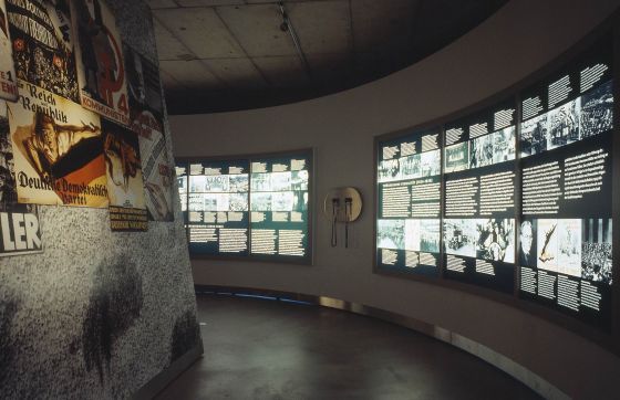 Großvitrinen in den Wänden sind jeweils Opfern oder Tätern gewidmet. Während sich das Layout bei den Opfern an deren Dokumente anpasst, bleibt es bei den Tätern starr. Die Opfer sind mit warmen Grautönen unterlegt, die Täter mit kalten Grautönen.