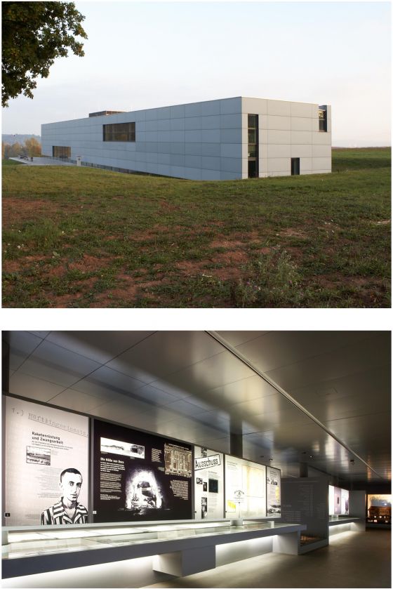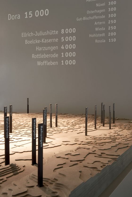 Mittels Displays und Vitrinen wird die die Geschichte des Konzentrationslagers chronologisch und nach Themen erzählt. Jeweils ein Motiv ist als großer angeschnittener Freisteller hervorgehoben, was dem Ganzen fast einen Magazincharakter gibt.