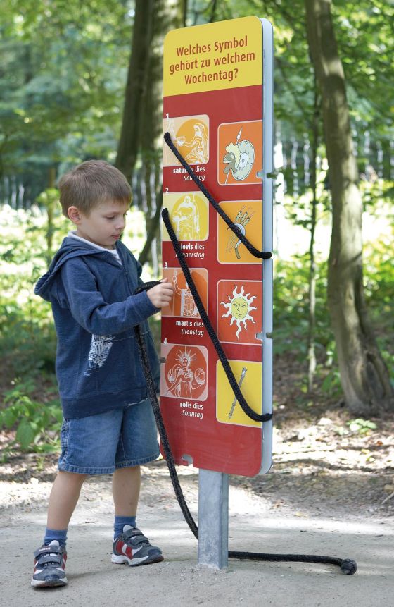 So lassen sich z. B an »Maxibandolinos« Antwort und Frage per Seil verbinden, am »Dreh-Kubus« moderne und antike Figuren korrekt zusammensetzen oder am römischen Kalender das aktuelle Datum korrekt stecken – der Römer Parcours kann durchaus mit den anderen Attraktionen des Freizeitparks mithalten und lehrt ganz nebenbei den Alltag von Titus zu römischen Zeiten mit dem eigenen zu vergleichen.