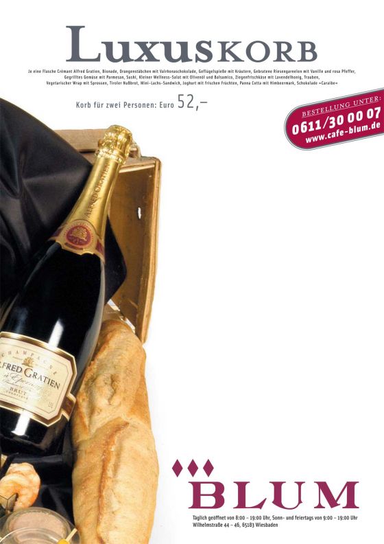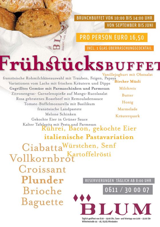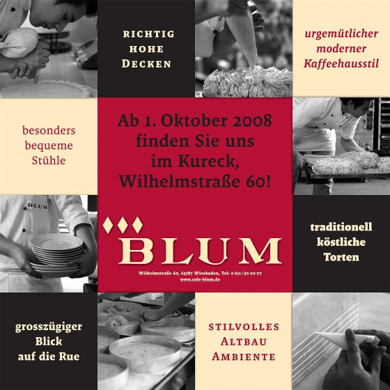 Als eine junge, dynamische neue Besitzerin das traditionsreiche Café Blum übernahm entwickelte sich eine spannende, vertrauensvolle Zusammenarbeit, in der ganz unterschiedliche Ansätze sowohl für das Stammhaus in Wiesbaden, wie der Mainzer Filiale und dem neuen Restaurant »Leib und Seele« entstanden.