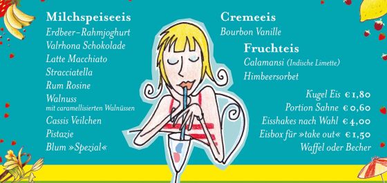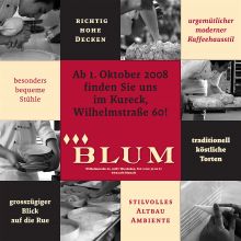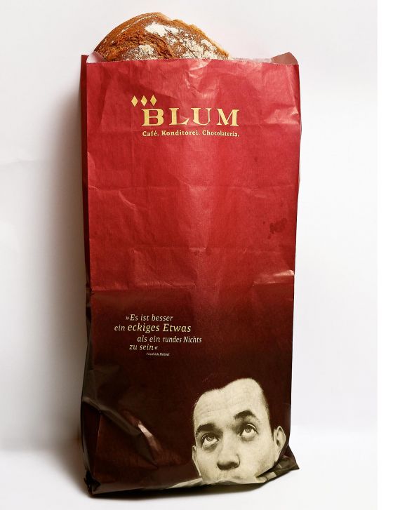 Zum einen gab es immer wieder Speisekarten zu gestalten, aber auch Schachteln für hausgemachte Kuchen, Tüten für Brot und Tragetaschen sollten das besondere des Café Blum unterstreichen. Der Humor kam nicht immer auf Anhieb gut an – aber auf Dauer bekam das Blum ein moderneres, frecheres Image, ohne die Stammkundschaft zu verprellen.