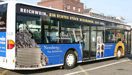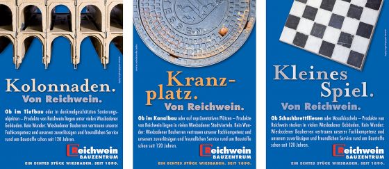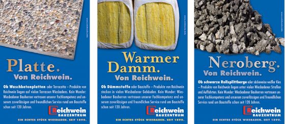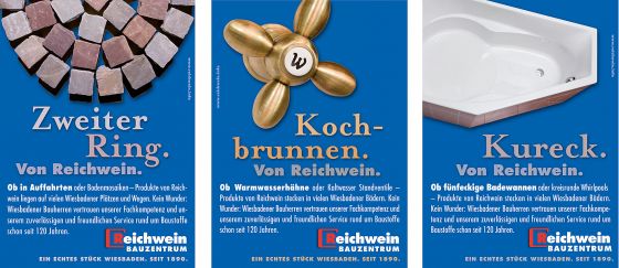 Die Imagekampagne besteht aus einem Wort-Bild-Spiel, das Wiesbadener Lokalitäten mit Baustoffen verbindet. Nur Bewohner verstehen den regionalen Bezug des Witzes. Somit wird der Aspekt der Ortsansässigkeit von Reichwein tief verankert.